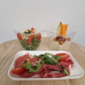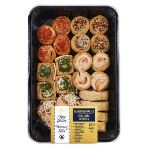 Halve kreeft Belle-vue, tomaat-garnaal, zalm Belle-vue, zalm graved lax, scampispiesje, salade coquille-truffel, ham-meloen, ham-asperge, vitello tonnato, rundscarpaccio, koude groentenschotel, stokbrood, trio van sauzen.
