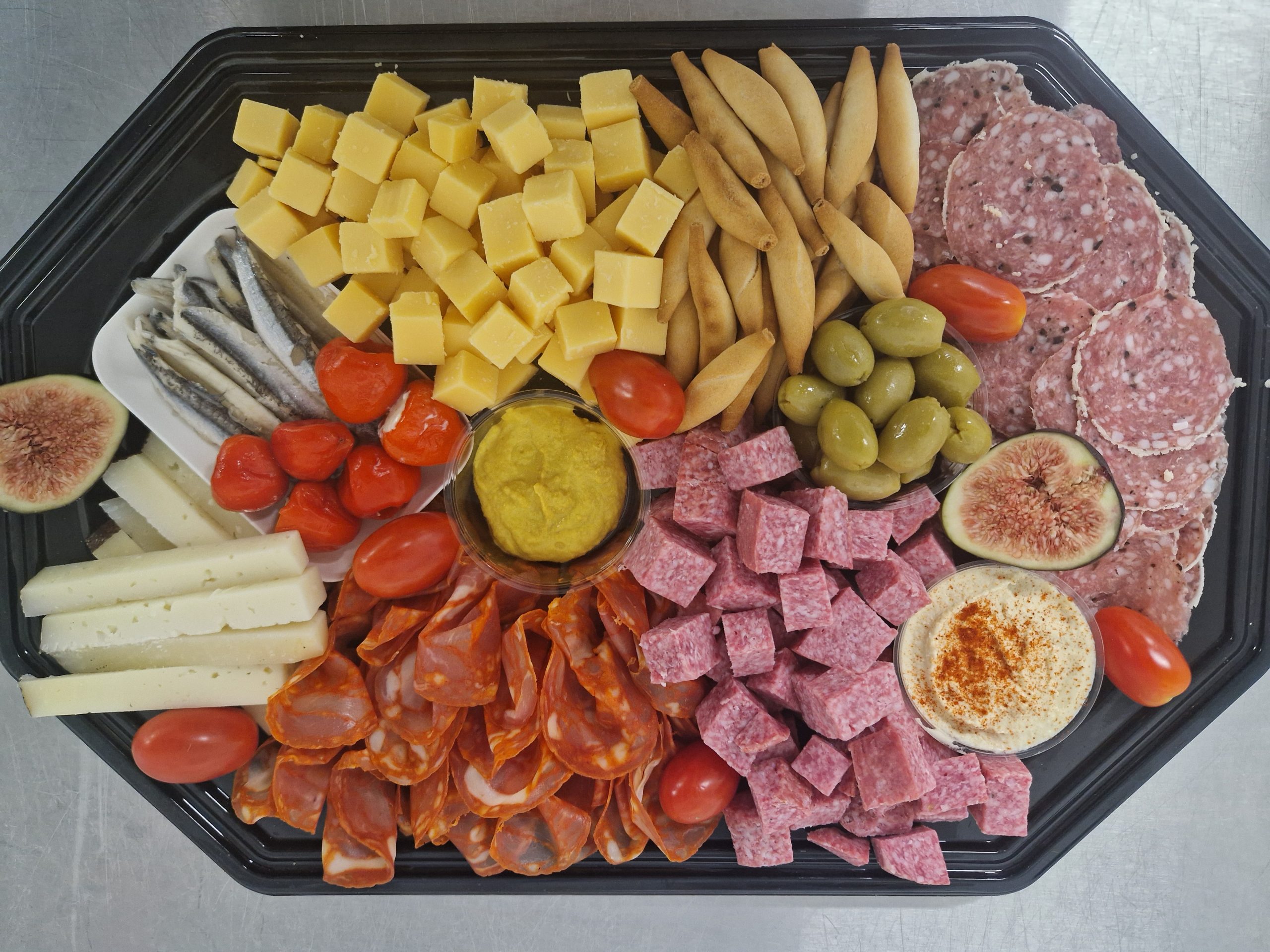 Assortiment kaas- en vleeswaren, olijven, hummus, ansjovis, pepers met roomkaas, grissini.